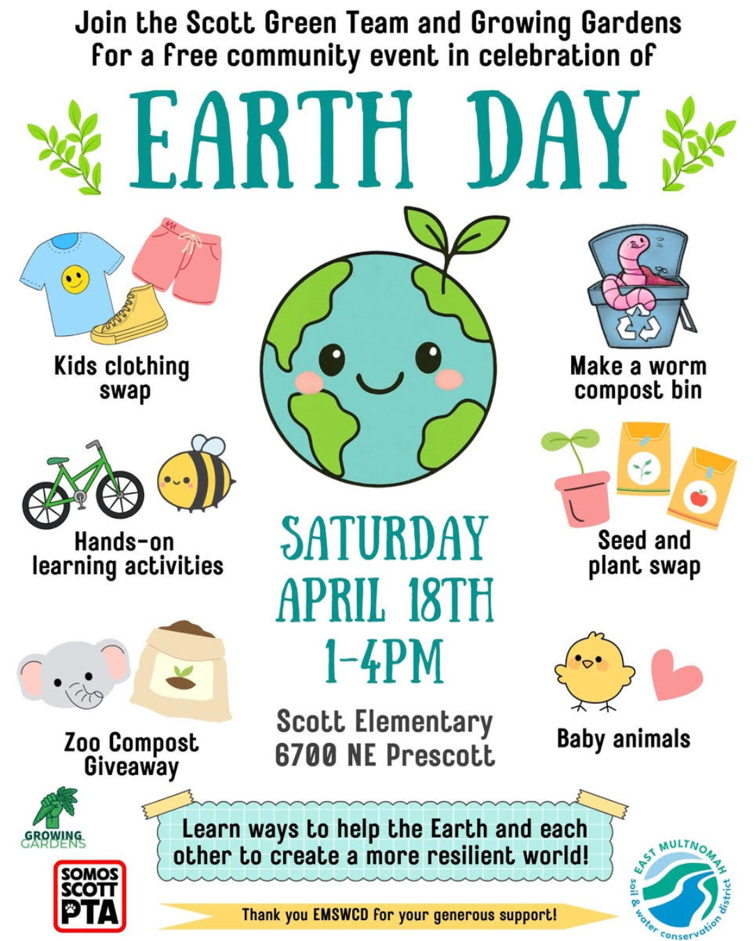 Join us for the 5th Annual Scott Community Earth Day Celebration, a free family-friendly event featuring hands-on sustainability activities, gardening education, community resources, live music, and joyful opportunities to connect with neighbors.